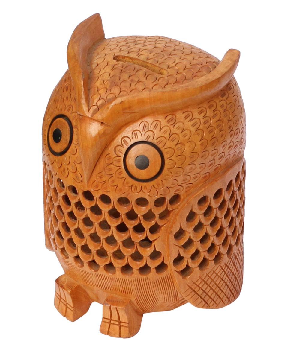This cute piggy bank carved in best of the woods brings a great way to save money and decorate the surroundings. In owl shape and filigree work, this piece looks art in itself!